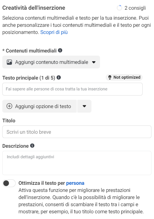 Se, invece, volessimo testare nuove creatività, si aprono tantissime possibilità e combinazioni. Anche qui l’AI fa un ottimo lavoro di automazione e perfezionamento in quanto permette di aggiungere fino a 5 testi diversi per ogni inserzione (oltre a mantenere la classica impostazione di poter scegliere una determinata creatività per un certo tipo di posizionamento). Ciò significa che gestirà tutte le combinazioni possibili in maniera ottimale, assicurandosi che il giusto accoppiamento di copy e immagine/video arrivi alla porzione di pubblico più adatta. E non è finita qui. Adesso le campagne Advantage+ offrono anche la possibilità di ottimizzare il testo stesso a seconda della persona: per esempio, se si spunta questa opzione, gli si dà la possibilità di mostrare il titolo o la descrizione come testo principale ad una parte di pubblico che potrebbe apprezzare di più una combinazione alternativa.