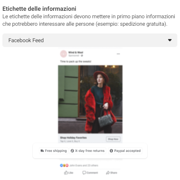 Un’ultima novità delle inserzioni Advantage+ che le rende più immediate e profittevoli, è la possibilità di aggiungere etichette delle informazioni aggiuntive sulla tua azienda, quali spedizione gratuita, i vari tipi di pagamento disponibili e tanti altri servizi ancora che possano essere di immediato interesse o imprescindibili per l’utente.