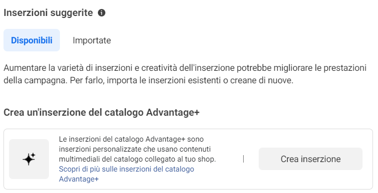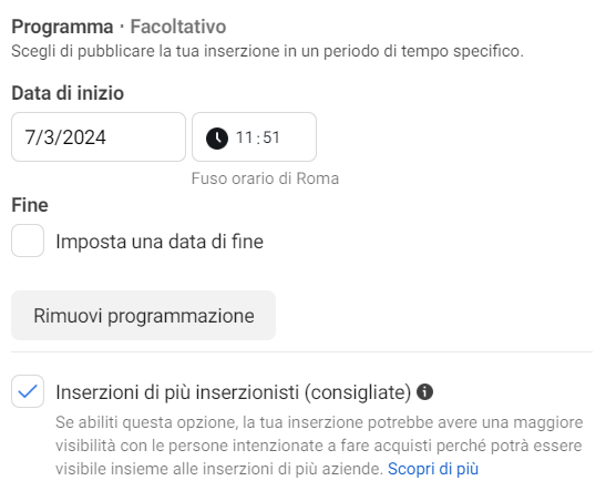 Una volta superato lo scoglio più grande di una campagna manuale, ci ritroviamo già a scegliere le nostre inserzioni. La maniera più rapida, nonché altra impostazione innovativa di queste campagne automatiche, è importare inserzioni usate in precedenza. Anche questo è un uso iper-ottimizzato delle nostre risorse: grazie ai dati raccolti da vecchie campagne si può “riciclare” materiale che ha portato risultati tangibili e continuare a fargli generare profitti grazie alle automazioni su pubblico e posizionamenti dell’ai che abbiamo appena visto. È possibile, qualora si voglia, programmare anche l’inserzione stessa a seconda del periodo in cui serve che venga mostrata al pubblico.