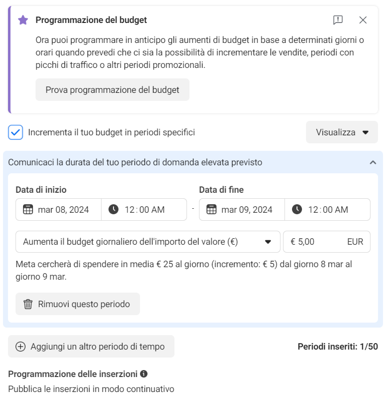 Una volta scelto l’obiettivo vendita, è il momento di impostare il budget e qui già si vede la prima grande differenza. Se prima, infatti, bisognava aumentare manualmente la spesa in periodi particolarmente propizi, ora basta indicare in quali giorni specifici vogliamo che questo venga fatto in maniera automatica e la somma da aggiungere, potendo scegliere fino a 50 periodi di tempo diversi. L’algoritmo gestirà in modo dinamico il budget tra diversi set di annunci e pubblici per assicurarsi che venga speso nel modo più efficace possibile, mirando a massimizzare il ritorno sull’investimento senza richiedere interventi manuali frequenti ed evitando sprechi di denaro. Questa nuova opzione è davvero comoda per gestire periodi cruciali in prossimità di eventi specifici oppure festività, come Natale, Black Friday, saldi di fine stagione e tanti altri.